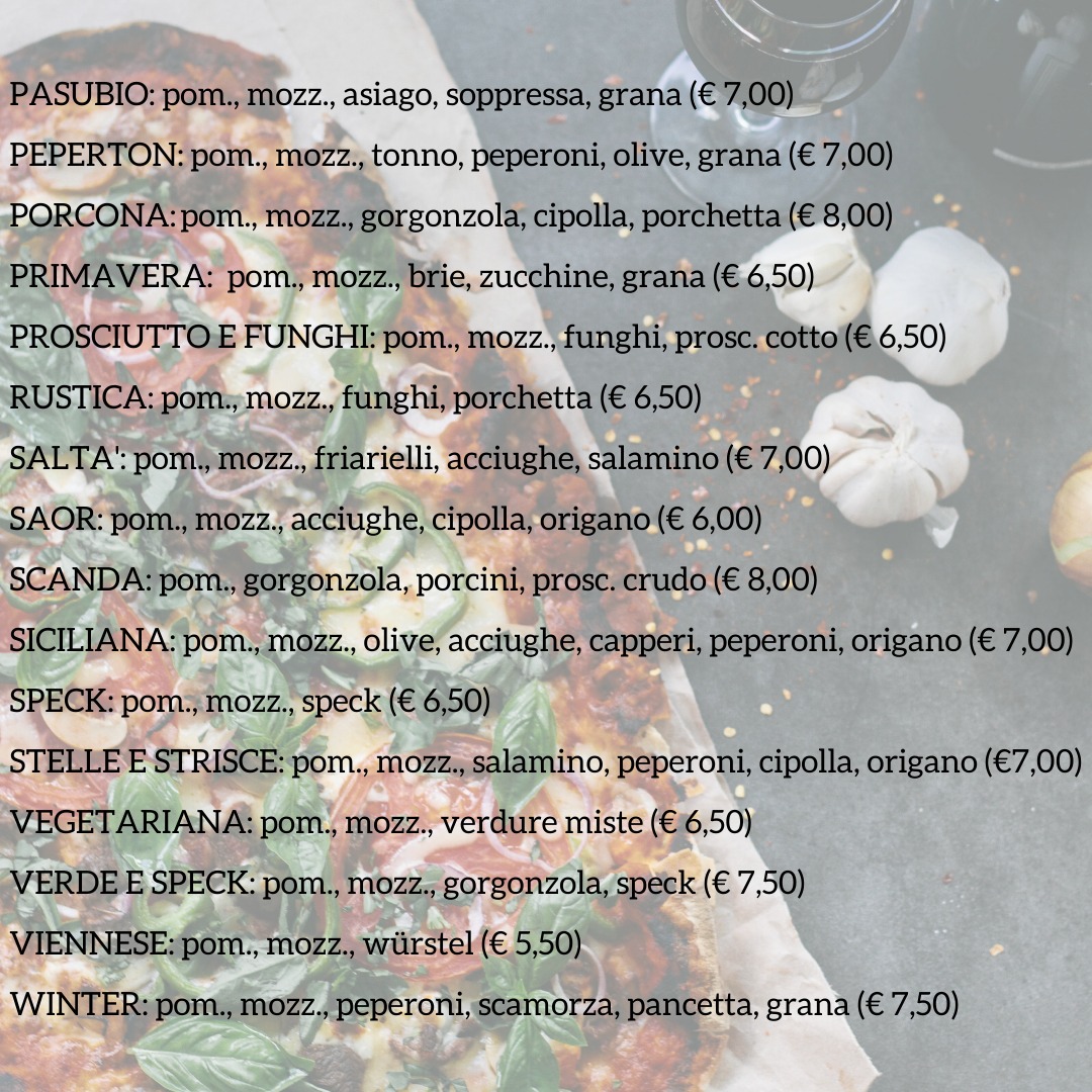 The menu highlights a variety of flavors, including freshly prepared bruschette, such as those topped with salami, tuna and onion, or the special combination of mortadella, pistachios, and burrata on pinsa. On the drinks side, you’ll find classic selections like Americano, prosecco, and a range of craft and local beers, including well-known labels thoughtfully paired with light snacks. Seasonal warm drinks like vin brulé and bombardino make cozy options when the weather calls for something soothing.